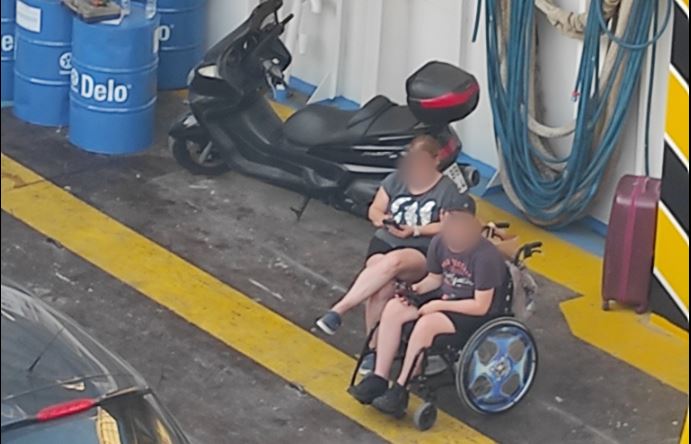 Σε ανάρτηση στο Facebook φαίνονται φωτογραφίες που δείχνουν ένα παιδί σε αναπηρικό αμαξίδιο μαζί με την συνοδό του να βρίσκονται στο γκαράζ του πλοίου εν μέσω αφόρητης ζέστης, καθώς δεν υπήρχε ράμπα αναπήρων.