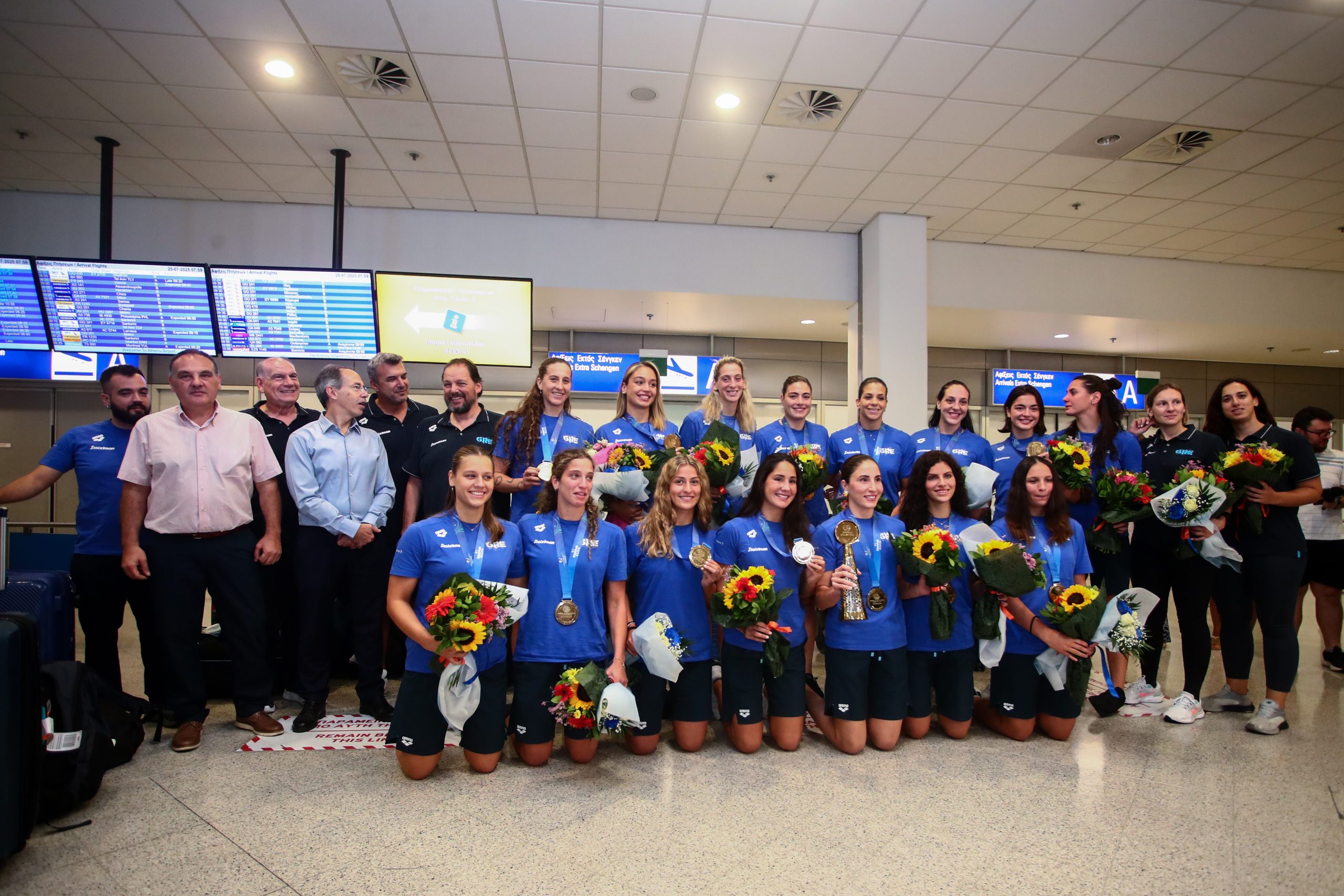 Τα χρυσά κορίτσια της Εθνικής Πόλο Γυναικών έφτασαν από τη Σιγκαπούρη στο αεροδρόμιο «Ελευθέριος Βενιζέλος», ενώ εκεί τους περίμεναν συγγενείς και φίλοι με λουλούδια στα χέρια και χαμόγελα.