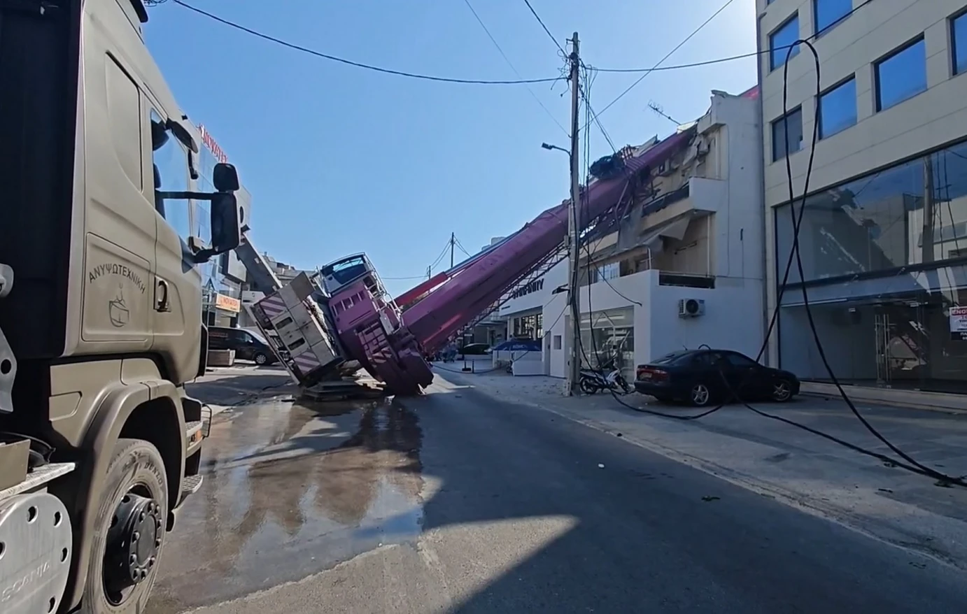 Μεγάλη επιχείρηση της Πυροσβεστική στην οδό Αρκαδία στο Περιστέρι, όπου ένα γερανοφόρο όχημα, έπεσε πάνω διώροφη κατοικία, προκαλώντας ζημιές.