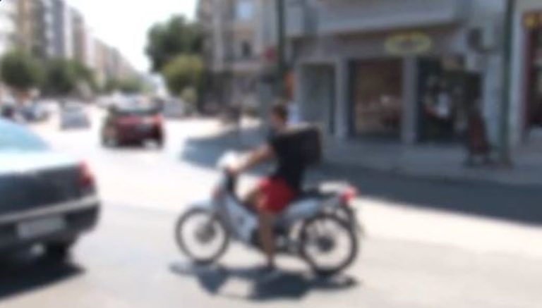 Η κάμερα του MEGA καταγράφει σε λίγα λεπτά μοτοσικλετιστές, τον έναν μετά τον άλλον, χωρίς την χρήση προστατευτικού κράνους. Ούτε οι συνεπιβάτες φορούν. Σε άλλη περίπτωση διανομέας εργάζεται χωρίς κράνος.
