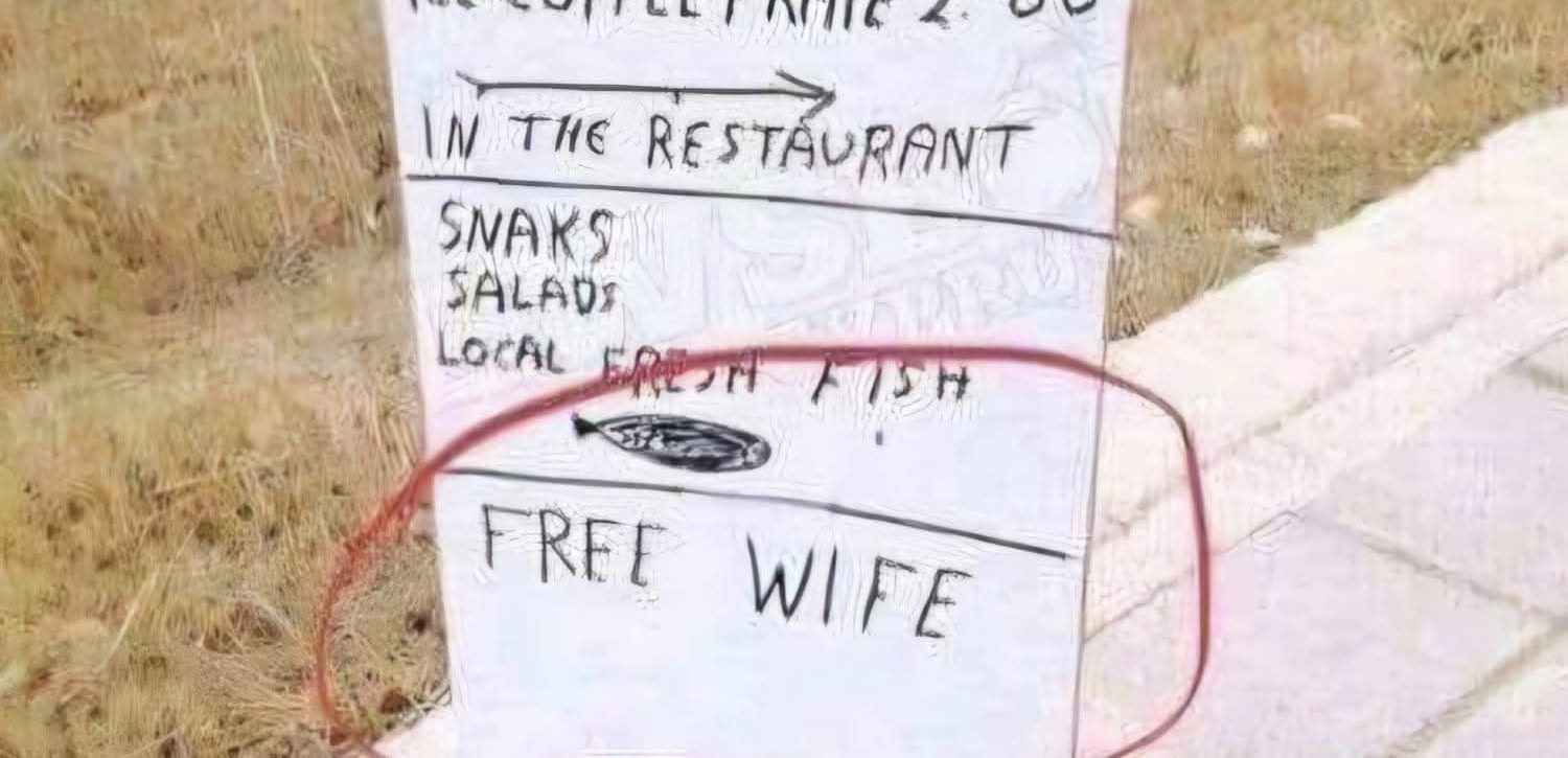 Συγκεκριμένα ένα μαγαζί αντί να γράψει «Free wifi» έγραψε «Free Wife», δηλαδή αντί για δωρεάν ίντερνετ «υπόσχονται» μία δωρεάν σύζυγο. «Χοντρό» ορθογραφικό, ειδικά για ανθρώπους που ψάχνουν την αγάπη και πάνε εκεί με λάθος ελπίδες και άντε μετά το μαγαζί να προσπαθήσει να σώσει το… λάθος!