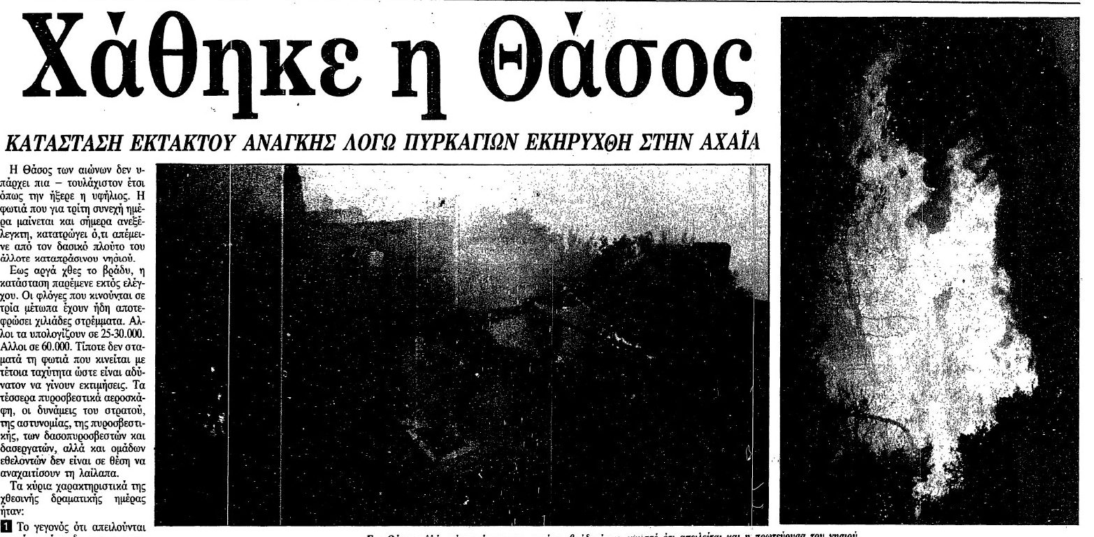 Το ημερολόγιο έγραφε 18 Αυγούστου 1989 όταν οι κάτοικοι της Θάσου έζησαν έναν εφιάλτη, με μία καταστροφική πυρκαγιά που ξεκίνησε από τέσσερις διαφορετικές εστίες ταυτόχρονα. Μάλιστα η ζημιά που άφησε πίσω της, έμοιαζε με εικόνα βιβλικής καταστροφής.