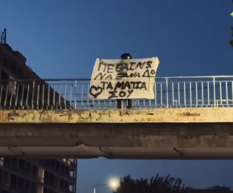 Συγκεκριμένα ένας άνδρας βρισκόταν πάνω στη γέφυρα, ο οποίος κρατούσε ένα πανό «Πεθαίνω να ξαναδώ τα μάτια σου» και δίπλα ζωγραφισμένη μια καρδιά.