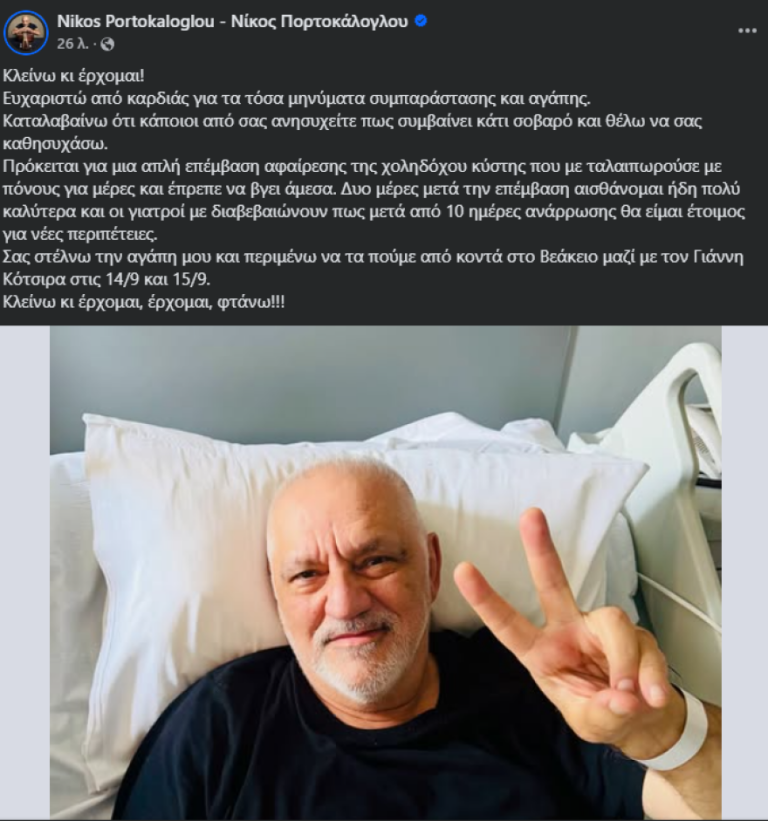 «Κλείνω κι έρχομαι! Ευχαριστώ από καρδιάς για τα τόσα μηνύματα συμπαράστασης και αγάπης», γράφει στην αρχή της δημοσίευσής του. Καταλαβαίνω ότι κάποιοι από σας ανησυχείτε πως συμβαίνει κάτι σοβαρό και θέλω να σας καθησυχάσω. Πρόκειται για μια απλή επέμβαση αφαίρεσης της χοληδόχου κύστης που με ταλαιπωρούσε με πόνους για μέρες και έπρεπε να βγει άμεσα. Δυο μέρες μετά την επέμβαση αισθάνομαι ήδη πολύ καλύτερα και οι γιατροί με διαβεβαιώνουν πως μετά από 10 ημέρες ανάρρωσης θα είμαι έτοιμος για νέες περιπέτειες».