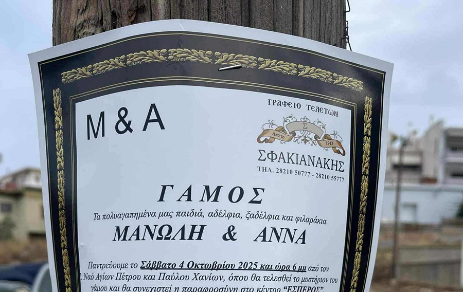 Ανάμεσα στο μακάβρια και το χιουμοριστική, κατατάσσεται η ιδέα ενός ιδιοκτήτη γραφείου τελετών στα Χανιά, να αναγγείλει τον γάμο του γιου του… με κηδειόχαρτο!