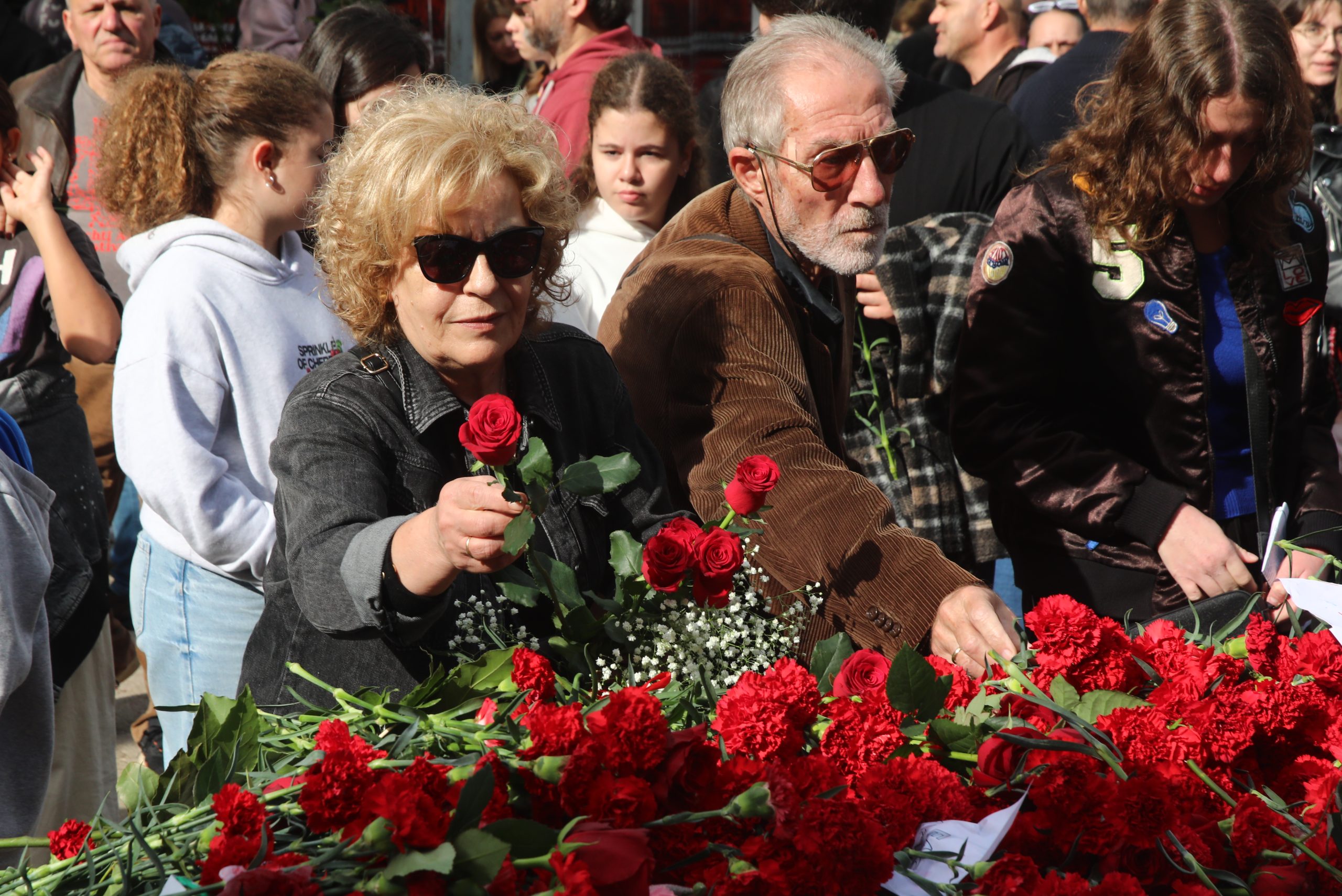 Παραδίπλα, η Αναστασία, 11 χρονών: «Ήρθα στο Πολυτεχνείο για να τιμήσω αυτούς που πεθάνανε για να είμαστε εμείς σήμερα ελεύθεροι». Μαζί της, η γιαγιά της. Τότε έμενε στην Αθήνα και οι μνήμες των ημερών εκείνων παραμένουν ζωντανές: «Είχαν βγει οι αστυνομικοί και καθάριζαν με τις μάνικες τα αίματα», είπε συγκινημένη.