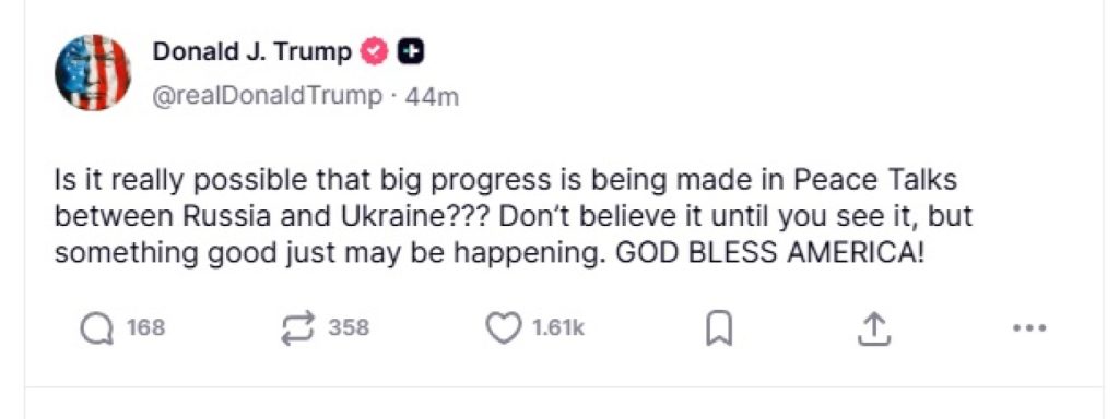 Σε ένα σύντομο μήνυμα στο Truth Social, ο Αμερικανός πρόεδρος έγραψε: «Είναι πραγματικά δυνατόν να σημειώνεται μεγάλη πρόοδος στις Ειρηνευτικές Συνομιλίες μεταξύ Ρωσίας και Ουκρανίας;;; Μην το πιστέψετε μέχρι να το δείτε, αλλά ίσως κάτι καλό να συμβαίνει».