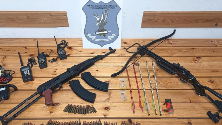 Οπλοστάσιο, αποτελούμενο από ένα καλάσνικοφ και μία βαλλίστρα, έκρυβαν 77χρονος και ο 44χρονος γιος του σε αποθήκη στο Πανόραμα Θεσσαλονίκης, όπως αποκάλυψε έρευνα του Τμήματος Δίωξης και Εξιχνίασης Εγκλημάτων Πολυγύρου Χαλκιδικής.