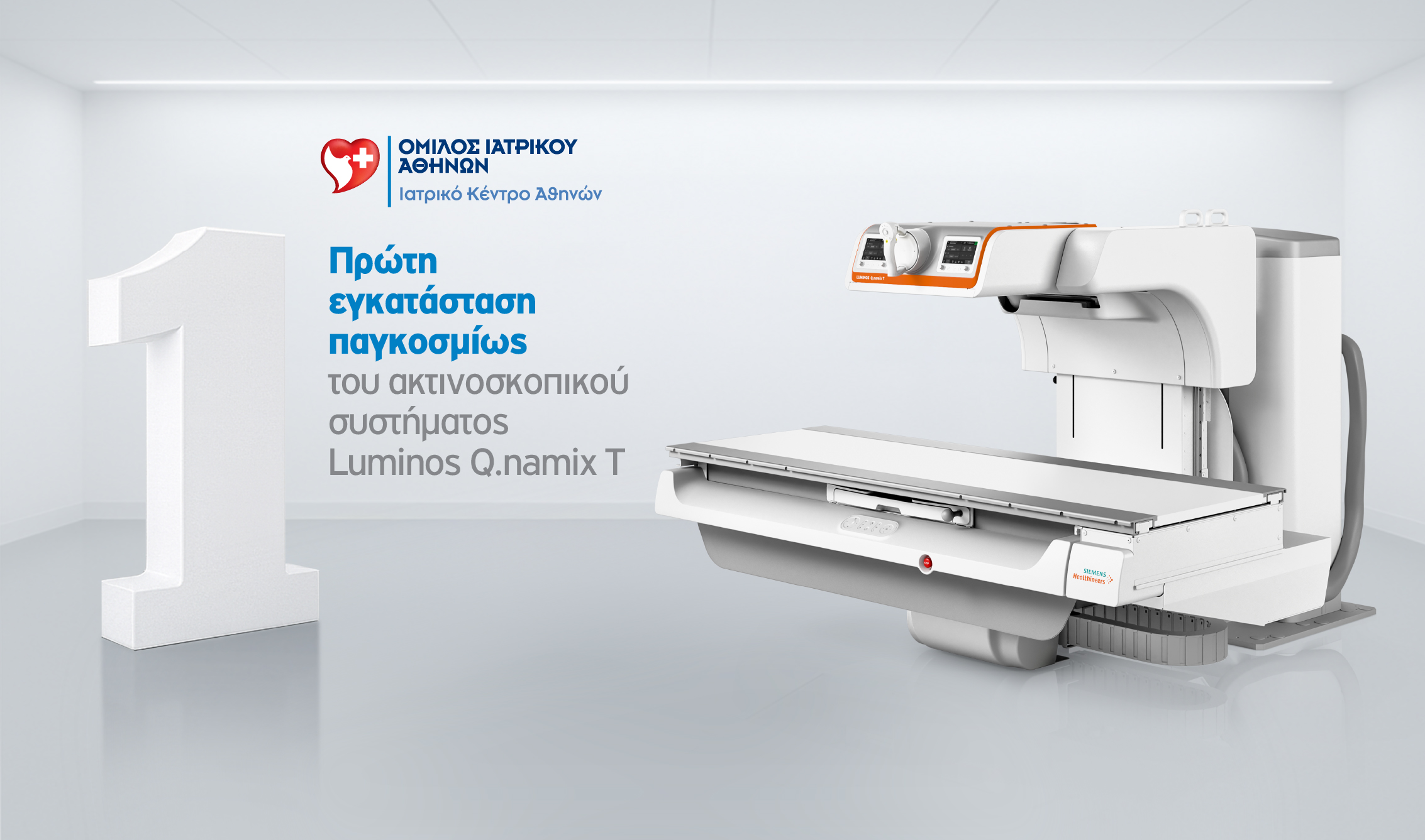 Ο Όμιλος Ιατρικού Αθηνών, πάντα ένα βήμα μπροστά στις εξελίξεις της ιατρικής τεχνολογίας, ανακοινώνει την πρώτη παγκοσμίως εγκατάσταση της νέας γενιάς ακτινοσκοπικού συστήματος Luminos Q.namix T, καθώς και την πρώτη εγκατάσταση στη Νότια Ευρώπη του ακτινοσκοπικού συστήματος Q.namix R της Siemens Healthineers στο Ιατρικό Κέντρο Αθηνών.