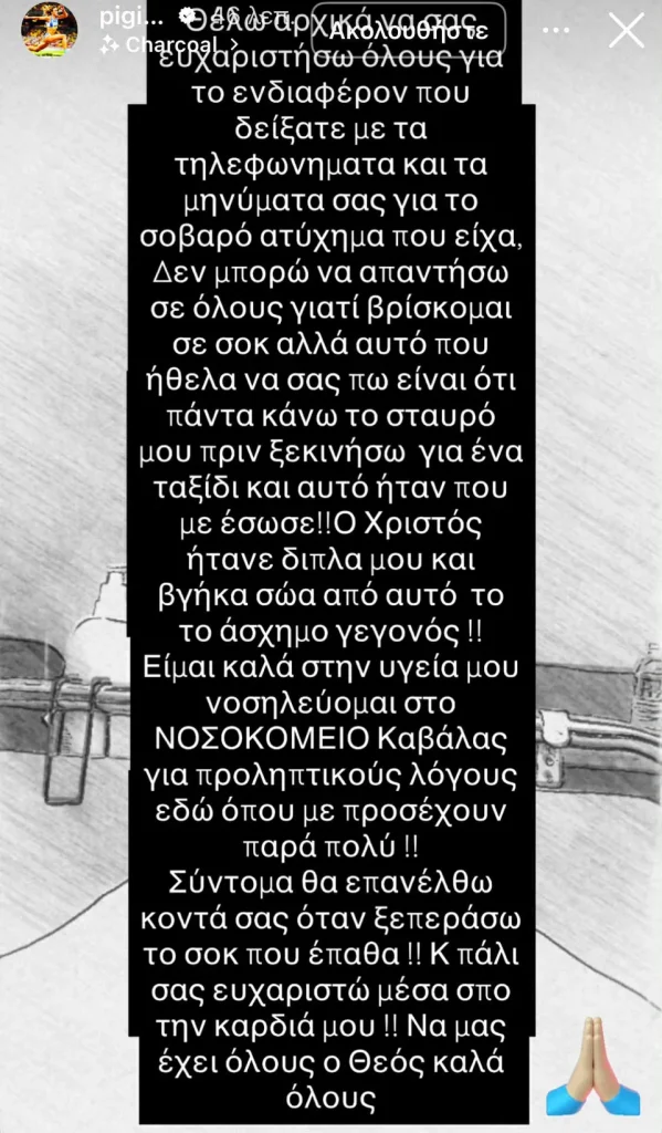 «Θέλω αρχικά να σας ευχαριστήσω όλους για το ενδιαφέρον που δείξατε με τα τηλεφωνήματα και τα μηνύματά σας για το σοβαρό ατύχημα που είχα. Δεν μπορώ να απαντήσω σε όλους γιατί βρίσκομαι σε σοκ, αλλά αυτό που ήθελα να σας πως είναι ότι πάντα κάνω τον σταυρό μου πριν ξεκινήσω ένα ταξίδι και αυτό ήταν που με έσωσε. Ο Χριστός ήταν δίπλα μου και βγήκα σώα από αυτό το άσχημο γεγονός. Είμαι καλά στην υγεία μου, νοσηλεύομαι στο νοσοκομείο Καβάλας για προληπτικούς λόγους εδώ όπου με προσέχουν πάρα πολύ», έγραψε σε story στο Instagram.