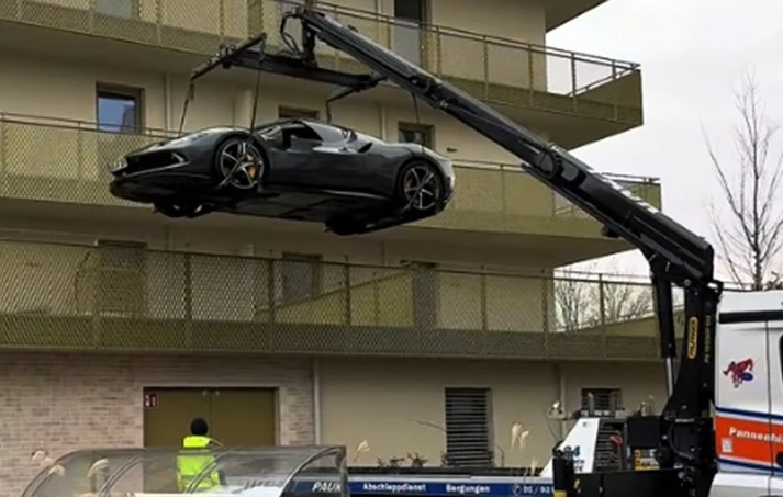 Το σπίτι του προφανώς δεν έχει ειδικό σύστημα μεταφοράς οχημάτων, οπότε με τη βοήθεια ενός γερανού ανέβασε το 1,4 τόνων supercar στο μπαλκόνι, πράγμα που του κόστισε αρκετές χιλιάδες ευρώ, όπως παραδέχτηκε.