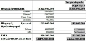 Σύμφωνα με την κυβέρνηση, από την 1η Ιανουαρίου μέχρι τις 31 Δεκεμβρίου 2025 προβλέπεται να έχουν καταβληθεί 3,8 δισεκατομμύρια ευρώ στους αγρότες από τον ΟΠΕΚΕΠΕ, τον Κρατικό Προϋπολογισμό και τον ΕΛΓΑ.