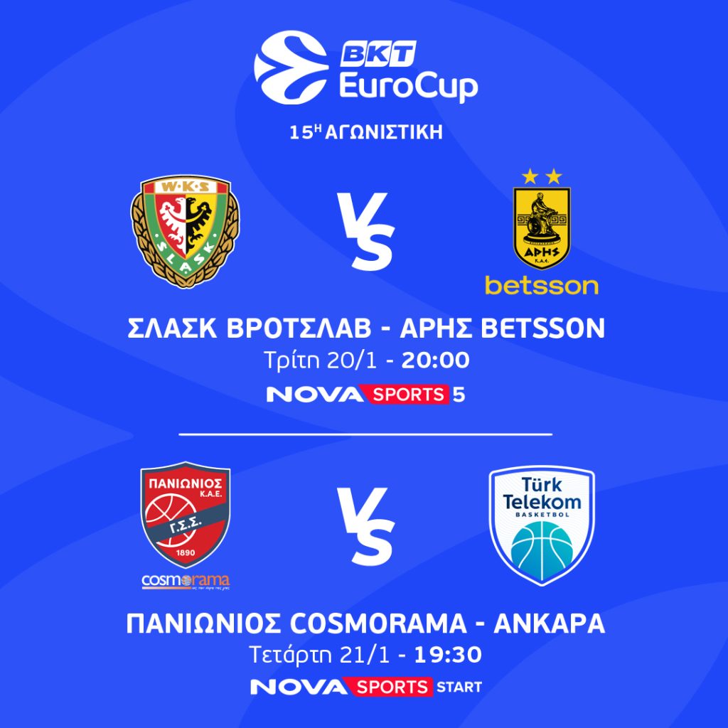 Το EuroCup συνεχίζεται με την 15η αγωνιστική οι συνδρομητές θα απολαύσουν τις αναμετρήσεις των δύο ελληνικών ομάδων, Σλασκ Βρότσλαβ-Άρης Betsson (20/1, 20:00) & Πανιώνιος Cosmorama Travel-Άνκαρα (21/1, 19:30).