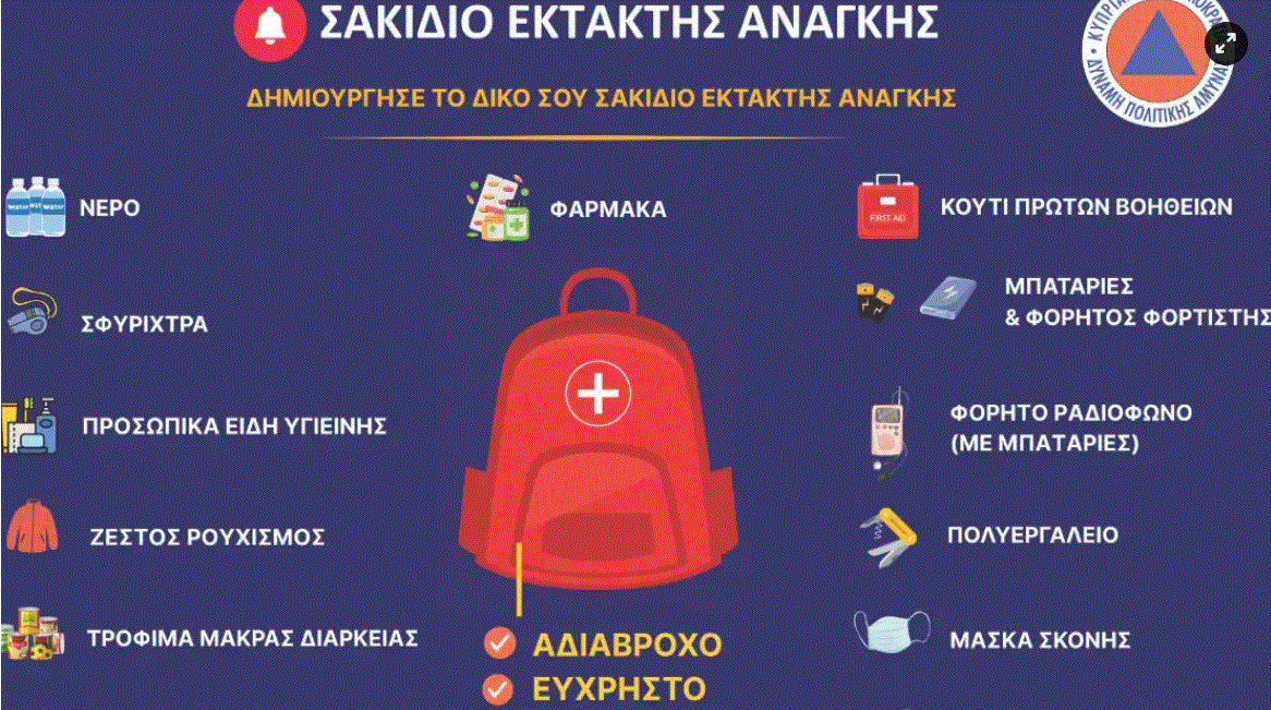 Εν μέσω αυξημένων εντάσεων στη Μέση Ανατολή και στον απόηχο της επίθεσης με drone στη βρετανική βάση στο Ακρωτήρι, το Υπουργείο Εσωτερικών της Κύπρου απευθύνει σύσταση προς τους πολίτες να προετοιμάσουν προληπτικά το δικό τους σακίδιο έκτακτης ανάγκης.