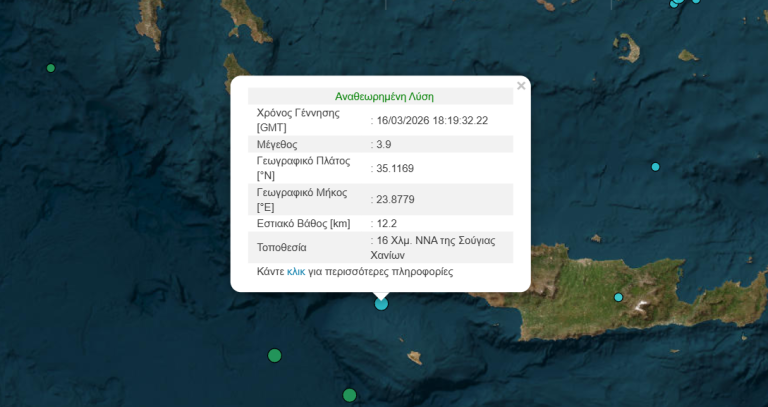 Σεισμική δόνηση μεγέθους 3,9 Ρίχτερ σημειώθηκε το βράδυ της Δευτέρας (16/3) σε θαλάσσια περιοχή, νότια των Χανίων.