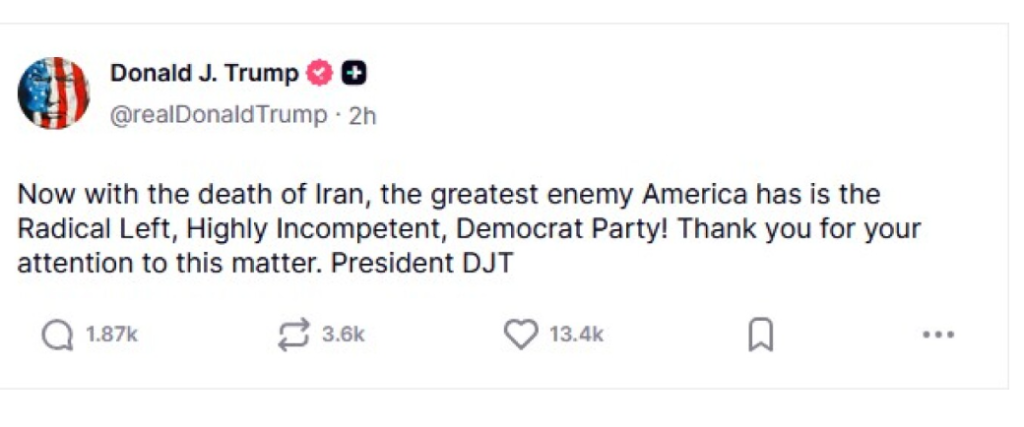 Μέσα από αναρτήσεις του, ο Αμερικανός πρόεδρος έκανε λόγο για «θάνατο του Ιράν», υιοθετώντας θριαμβευτικό τόνο για την πορεία των εξελίξεων. Την ίδια στιγμή, έστρεψε τα πυρά του στο εσωτερικό πολιτικό σκηνικό, υποστηρίζοντας ότι ο «μεγαλύτερος εχθρός» των Ηνωμένων Πολιτειών πλέον είναι η ριζοσπαστική Αριστερά και το Δημοκρατικό Κόμμα, το οποίο κατηγόρησε για ανικανότητα και ευθύνη σε σειρά προβλημάτων της χώρας.
