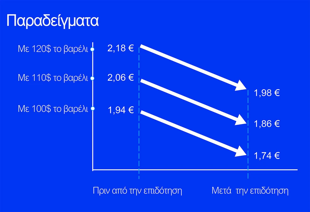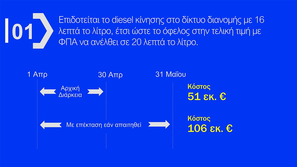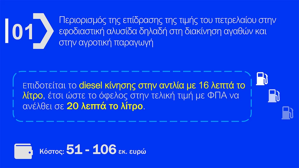 - Επιδοτούμενο diesel: Το diesel κίνησης στο δίκτυο διανομής θα επιδοτείται με 16 λεπτά ανά λίτρο, οδηγώντας σε μείωση 20 λεπτών στην τελική τιμή με ΦΠΑ.