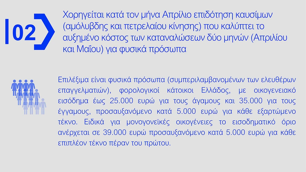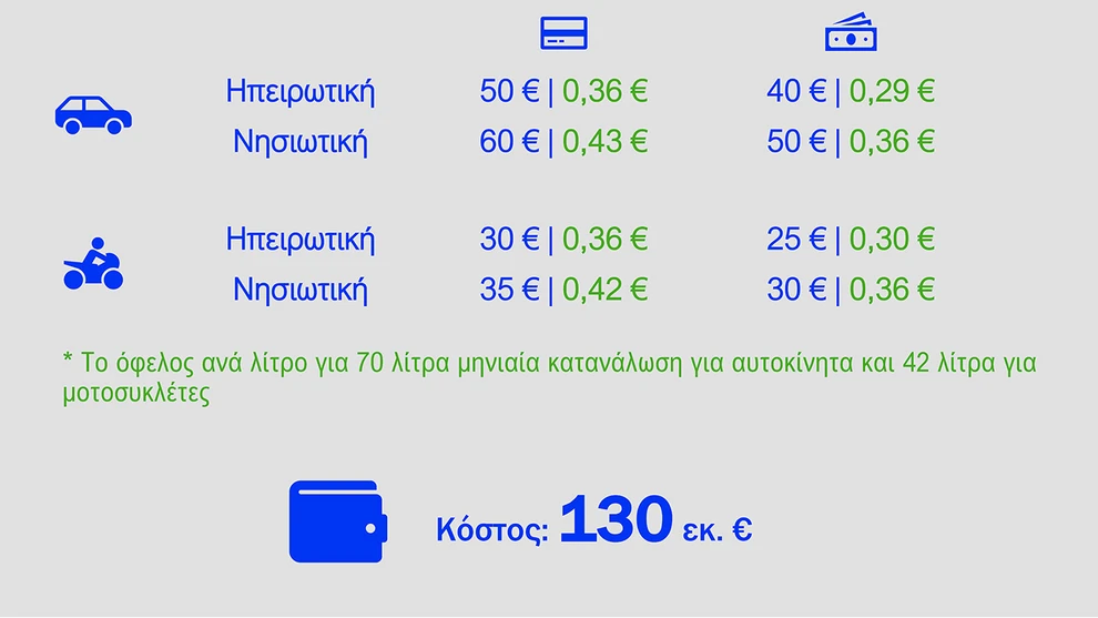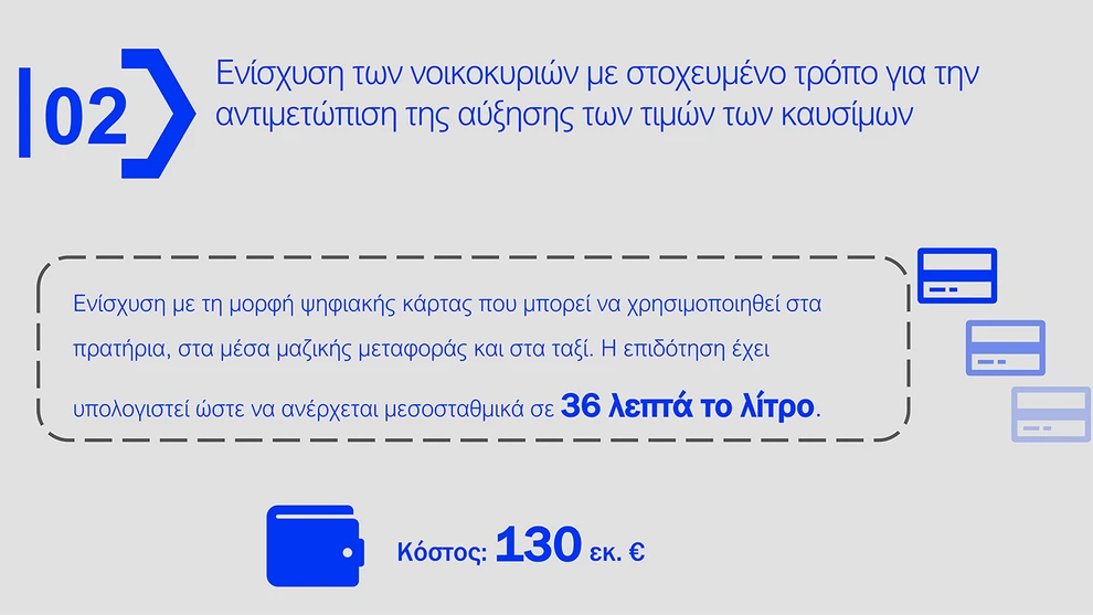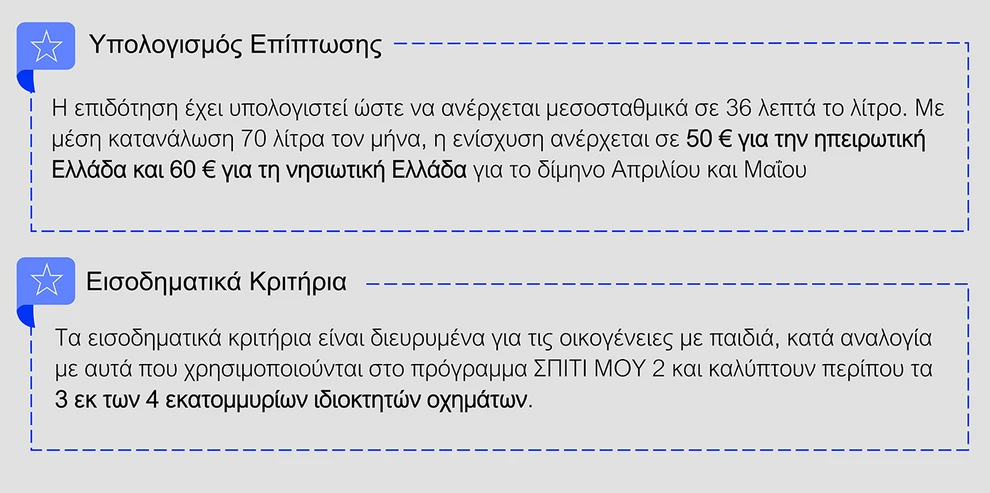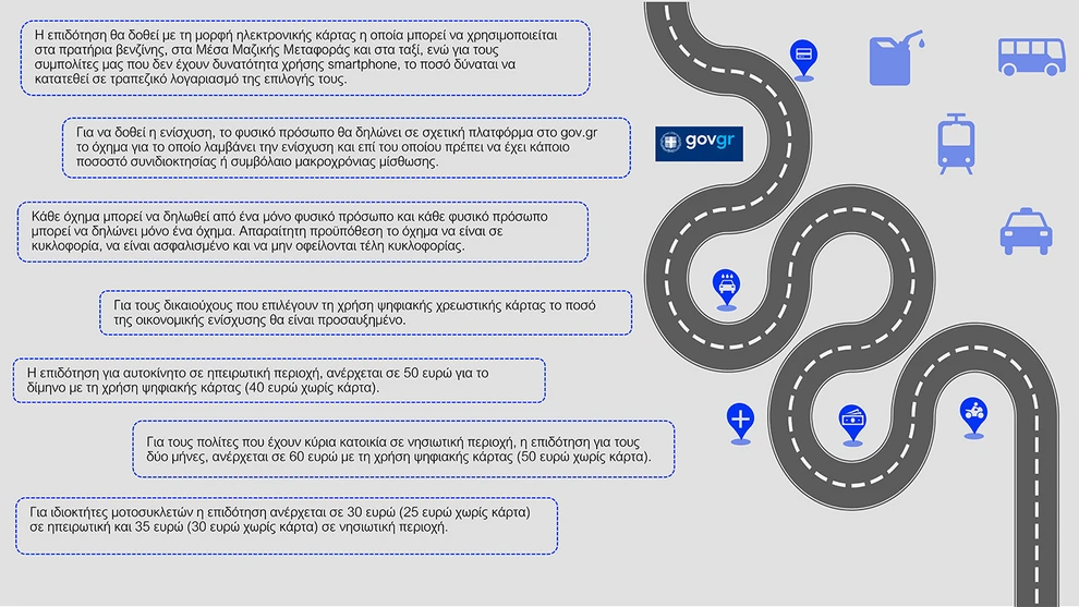 - Ψηφιακή Κάρτα Καυσίμων: Προβλέπεται για πρατήρια, ΜΜΜ και ταξί, με μέση επιδότηση 36 λεπτά ανά λίτρο. Σε μέση κατανάλωση 70 λίτρων μηνιαίως, η στήριξη ανέρχεται σε 50 ευρώ ανά δίμηνο στην ηπειρωτική χώρα και 60 ευρώ στα νησιά.