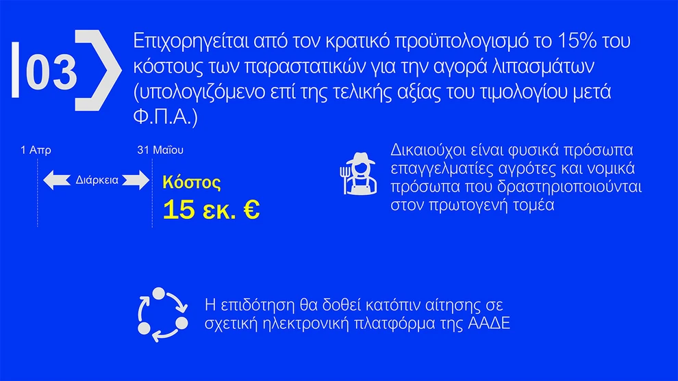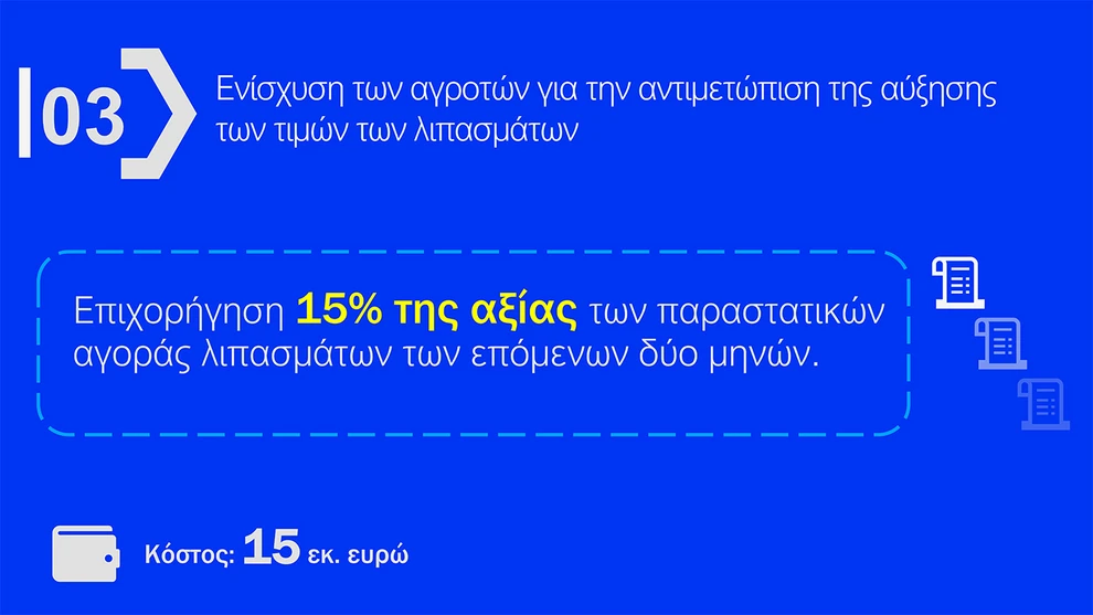 - Στήριξη αγροτών: Επιχορηγείται το 15% του ύψους των παραστατικών αγοράς λιπασμάτων, προκειμένου να αντιμετωπιστούν οι απότομες αυξήσεις.