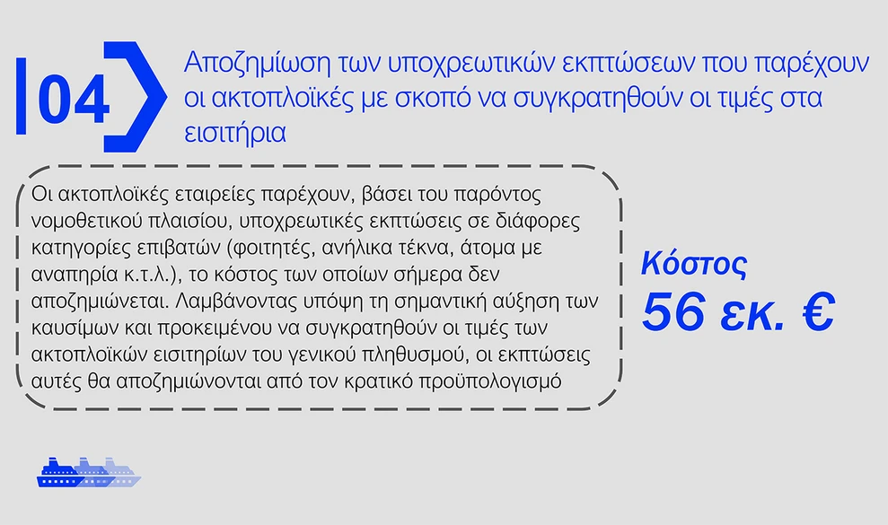- Ακτοπλοϊκές αποζημιώσεις: Θα χορηγούνται με υποχρεωτικές εκπτώσεις στα εισιτήρια, ώστε να συγκρατηθούν οι τιμές στα περσινά επίπεδα.