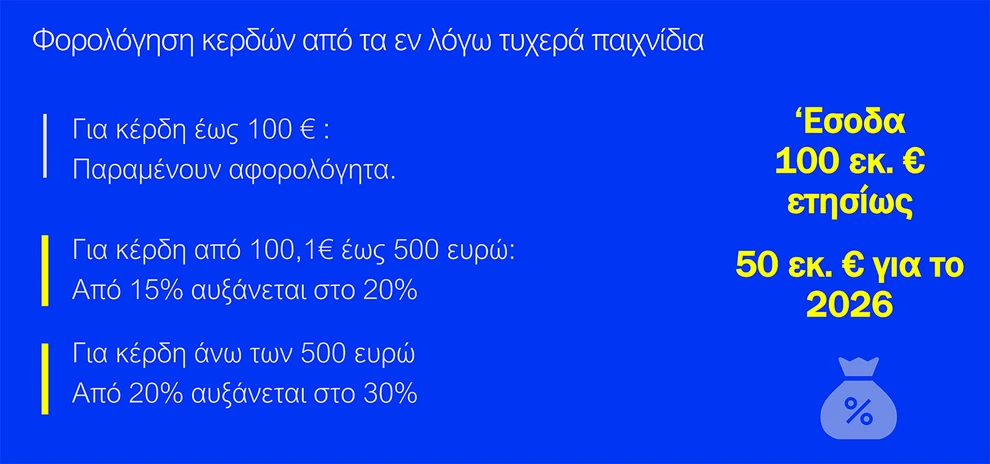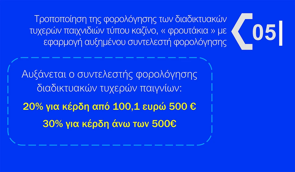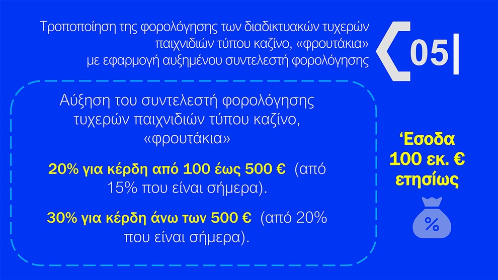 Το κόστος των μέτρων θα καλυφθεί από τα δημόσια ταμεία και από τη νέα φορολόγηση των κερδών των παικτών διαδικτυακών τυχερών παιχνιδιών τύπου «καζίνο», εξασφαλίζοντας 100 εκατ. ευρώ.
