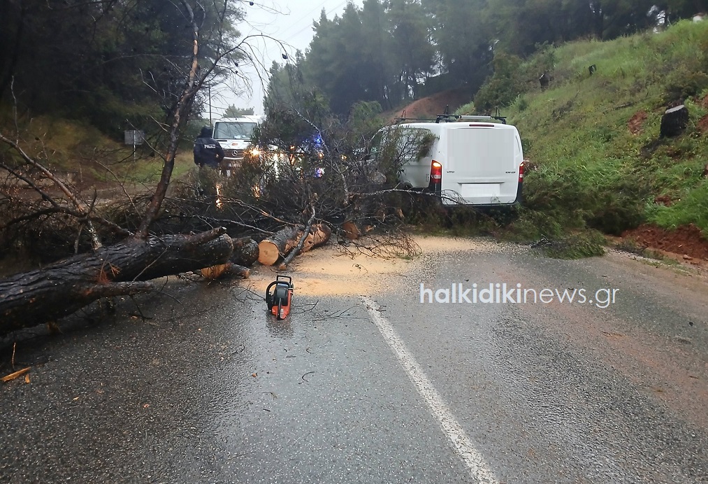 Η κακοκαιρία «Erminio» σαρώνει τη Χαλκιδική, προκαλώντας σοβαρά προβλήματα στο οδικό δίκτυο, με έντονη βροχόπτωση, ισχυρούς ανέμους και ολισθηρό οδόστρωμα. Όπως αναφέρει το halkidikinews.gr, στην επαρχιακή οδό Σιθωνίας, στο τμήμα μεταξύ Νικήτης και Μεταμόρφωσης, ένα αυτοκίνητο συγκρούστηκε με πεύκο που είχε πέσει στο δρόμο λόγω των ανέμων, ενώ άλλο όχημα εξετράπη της πορείας του.