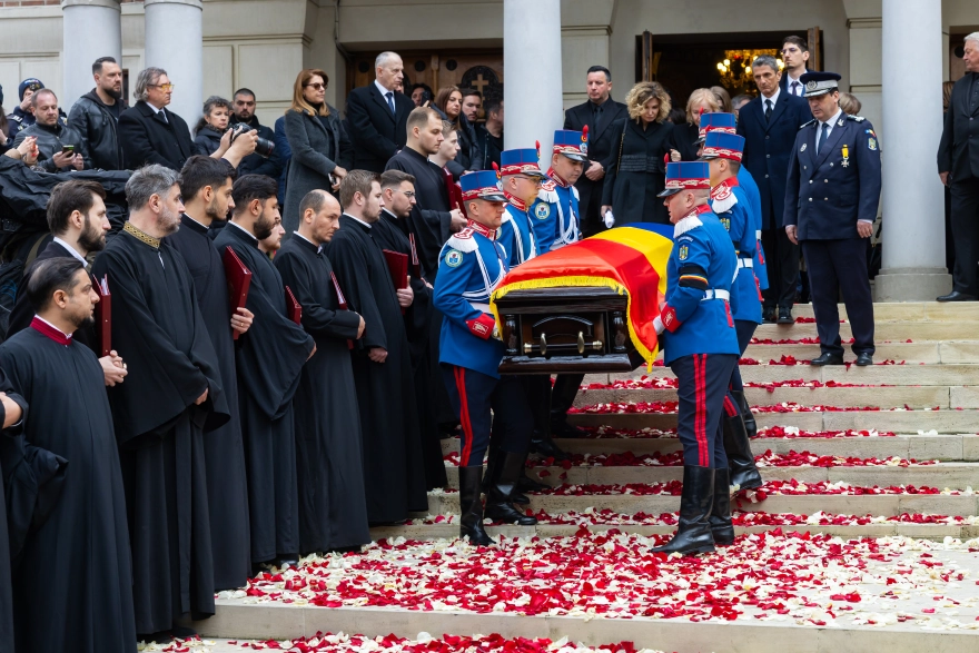 Το φέρετρο, καλυμμένο με τη σημαία της Ρουμανίας, έφτασε υπό τους ήχους της μπάντας της Χωροφυλακής, ενώ η Φρουρά Τιμής απέδωσε στρατιωτικές τιμές. Οι τρεις ομοβροντίες που ακολούθησαν «έσπασαν» τη σιωπή, λειτουργώντας ως ηχητικό αποτύπωμα ενός μεγάλου αποχαιρετισμού.