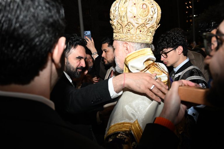 Μια ιδιαίτερη και απρόσμενη στιγμή καταγράφηκε κατά τη διάρκεια της ακολουθίας της Μεγάλης Παρασκευής στον Ιερό Ναό του Αγίου Νικολάου στο Μανχάταν, στη Νέα Υόρκη, όταν ο δήμαρχος της πόλης απηύθυνε ευχές στα ελληνικά προς τους πιστούς.