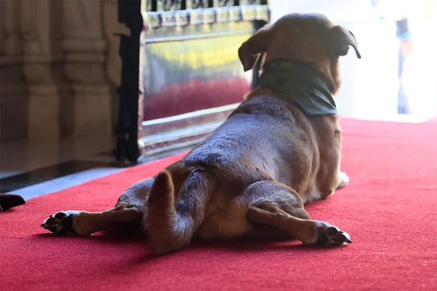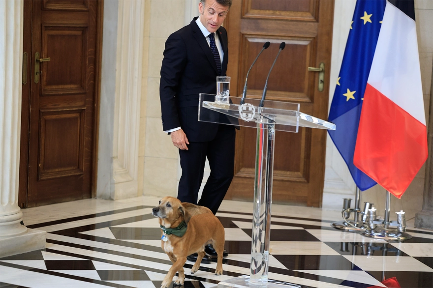 Καθώς ο Εμανουέλ Μακρόν κινούνταν στον χώρο, το βλέμμα του έπεσε στον τετράποδο «κάτοικο» του Μαξίμου. Ο Γάλλος πρόεδρος κοντοστάθηκε, χαμογέλασε και χωρίς δεύτερη σκέψη έσκυψε για να τον χαϊδέψει, σε μια αυθόρμητη κίνηση που απαθανάτισαν οι φωτογράφοι.